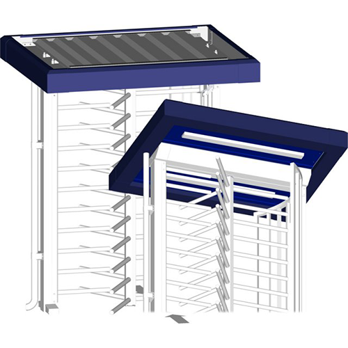 Dachkonstruktion mit innenliegender Regenrinne, feuerverzinktem Dach, umlaufender, pulverbeschichteter Dachblende, Untersichtverkleidung mit Leuchtkörpern.