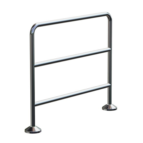 Konstruktion aus Rundprofil 40mm, CrNi, Werkstoff V2A, Oberfläche strichmattiert, Unterteilung durch 2 waagrechte Stäbe