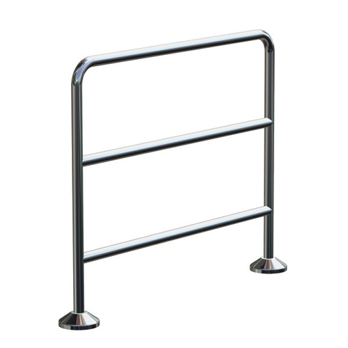 Konstruktion aus Rundprofil 40mm, CrNi, Werkstoff V2A, Oberfläche strichmattiert, Unterteilung durch 2 waagrechte Stäbe, Höhe 1.000 mm