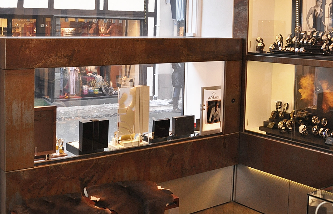 We supply complete, customized shopfitting and security solutions for racks and cabinets. The glass can be riveted, spliced, or folded, allowing complete cabinets or cases to be constructed from hammered glass. Our partners develop the fittings according to the customer's requirements and then coordinate production with suppliers to deliver a complete solution.