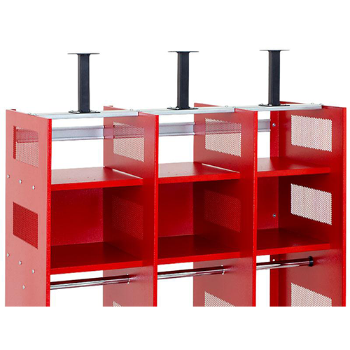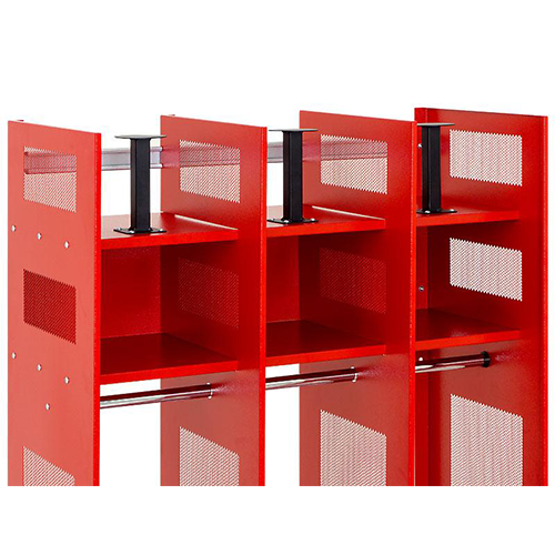 The perforated side panels ensure effective ventilation (80% air flow), allowing clothing to air out optimally. The steel shelves are equipped with 100 mm high feet and leveling screws. A tilting helmet holder is available as an optional accessory, making it easier to remove helmets.