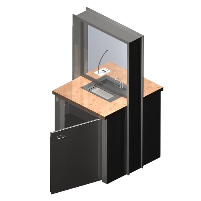 Ce portillon de transfert intérieur est utilisé dans les zones de sécurité des institutions financières, des banques centrales et des sociétés de valeurs mobilières pour la livraison et/ou l'encaissement d'espèces. Le P 8041 est également utilisé pour la livraison de matériel en entreprise ou la distribution de supports de données dans les centres de données. Il est équipé d'un vitrage blindé BR4-NS dans un cadre en acier peint, d'un élément de comptoir en acier inoxydable texturé lin avec plateau coulissant P 7032 FB4 intégré, d'un système mains libres DELTA 2.0 enfichable et d'un portillon à chariot P 9045 avec portes inspirées du modèle FB4.