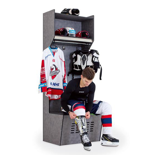 Le box de hockey sur glace HPL est fabriqué en stratifié haute pression extrêmement résistant et est idéal pour les vestiaires des clubs de hockey sur glace professionnels et semi-professionnels. Ce box universel est disponible en deux versions : une version joueur de 800 mm de large et une version gardien de 1 000 mm de large.
