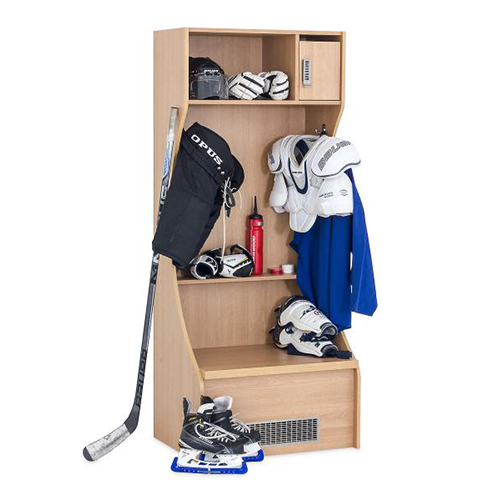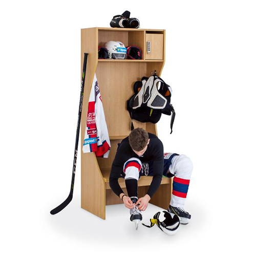 Le box de hockey sur glace stratifié est fabriqué en panneaux de particules stratifiés et est idéal pour les vestiaires des arénas et autres installations où des casiers verrouillables ne sont pas nécessaires. Il est disponible en deux versions : avec un espace ouvert ou fermé sous le banc. Chaque box peut accueillir jusqu'à deux personnes.