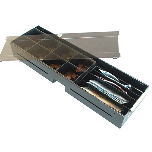 Questo inserto per registratore di cassa KE 54-D offre ampio spazio di archiviazione in un design compatto. Due fessure sulla parte anteriore consentono di inserire ricevute e banconote quando il cassetto è chiuso. Dietro gli scomparti per le banconote si trova uno spazio per i rotoli di contanti. Dopo aver completato il lavoro di cassiere, il KE 54-D può essere bloccato nel cassetto, rimosso e riposto nella cassaforte.