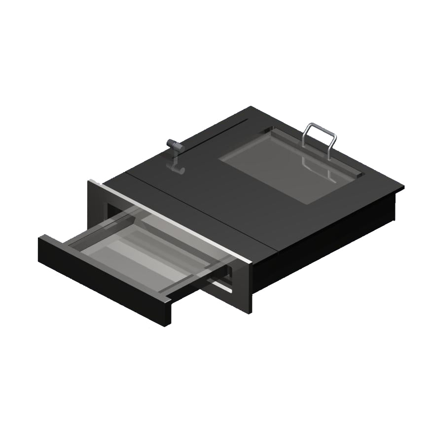 - Ausführung: Aussenblende und innere Abdeckungen in RAL 9006 weissaluminium, Mulde Edelstahl, Gehäuse RAL 9005 schwarz. Andere Farben oder Blende in Edelstahl auf Anfrage.