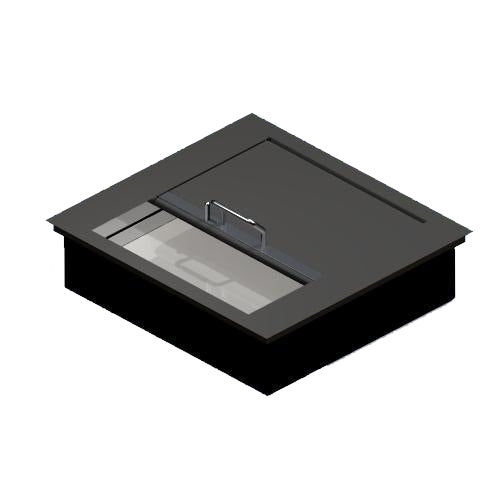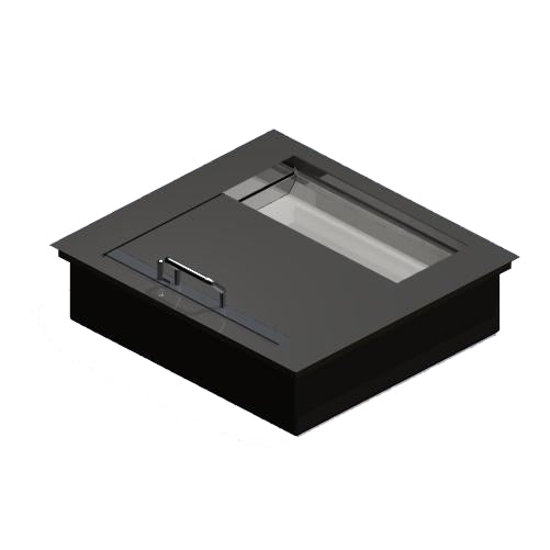 Die Schiebemulde wird von oben in den Thekenausschnitt eingelassen. Der umlaufende Rand deckt die Schnittkanten ab oder kann für eine flächenbündige Ausführung eingefräst werden. Ein Unterbau ist notwendig zur Lastabtragung. Zahlwagen und Einlegeblech sind aus Edelstahl gefertigt, das Gehäuse ist schwarz strukturlackiert (RAL 9005).